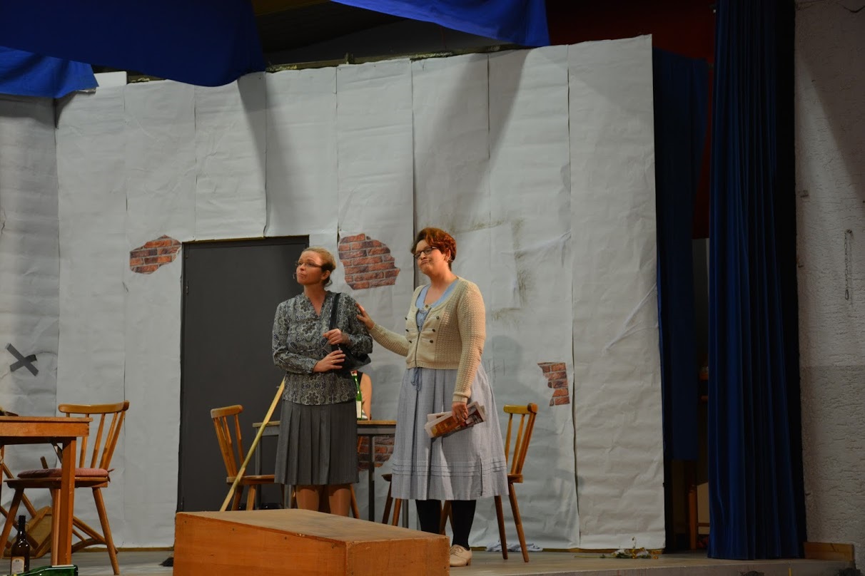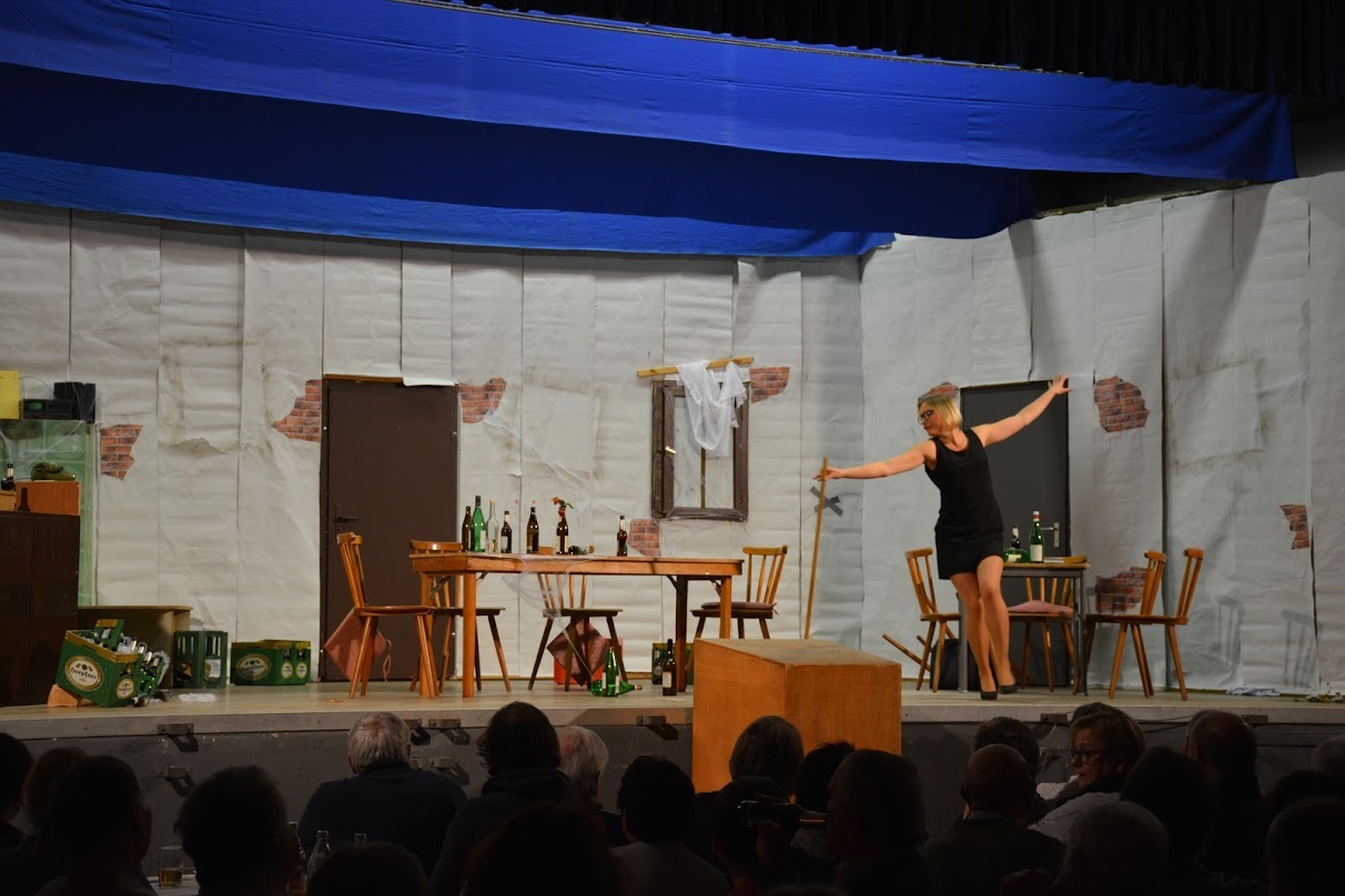 Was Ihr Schatz der Bürgermeister sagt, wird ohne Widerspruch gemacht. So fängt sie an, die Wirtschaft zu putzen, wenn man dies putzen nennen kann. Es sieht eher wie ein erotischer Tanz mit einem Besen aus. Wie gut, dass gerade zu diesem Zeitpunkt Lena die resolute Schwester von Max zu Besuch kommt. Schon der Anblick eines Staubkornes, lässt sie in Höchstformen von Putzen und Aufräumen auflaufen. Robust, durchsetzungsstark und rabiat zeigte Nicole Becker als Lena wie aus einer „Bruchbude“ wieder ein „Palast“ gemacht werden kann. Auch sie zeigte den Tanz mit dem Besen – nicht so erotisch – aber umso lustiger.