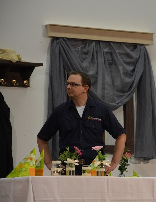 Bürgermeister Alfred malte sich aus, wie die Zehntscheuer zum neuen Feuerwehrgerätehaus umgebaut wird. Wären da nicht Brunhilde und Anneliese von der Pfarrgemeinde, die mit der Zehntscheuer ganz andere Pläne haben. Sie möchten, dass sie in Gruppenräume für den Kirchenchor, die Landjugendbewegung und die Frauenvereinigung umgebaut wird. Nadine Hanke spielte die Pfarrgemeinderatsvorsitzende Brunhilde so wie man sich eine Pfarrgemeinderatsvorsitzende oft vorstellt. Dazu kommen noch die Eigenschaften von scheinheilig, herrschsüchtig und immer nur auf den eigenen Vorteil bedacht. Altmodischer und unselbständiger wie die Pfarrgemeinderätin Anneliese geht es nicht mehr. Dies verkörperte Christiane Weber so naturgetreu, dass das Publikum ihr wahres Alter niemals erraten würde.